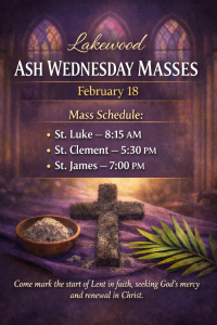 Ash Wednesday February 18, 2026 5:30 pm - 6:30 pm St James Church Please, join us at either: St. Luke – 8:15 am St. Clement – 5:30 pm St. James – 7:00 pm