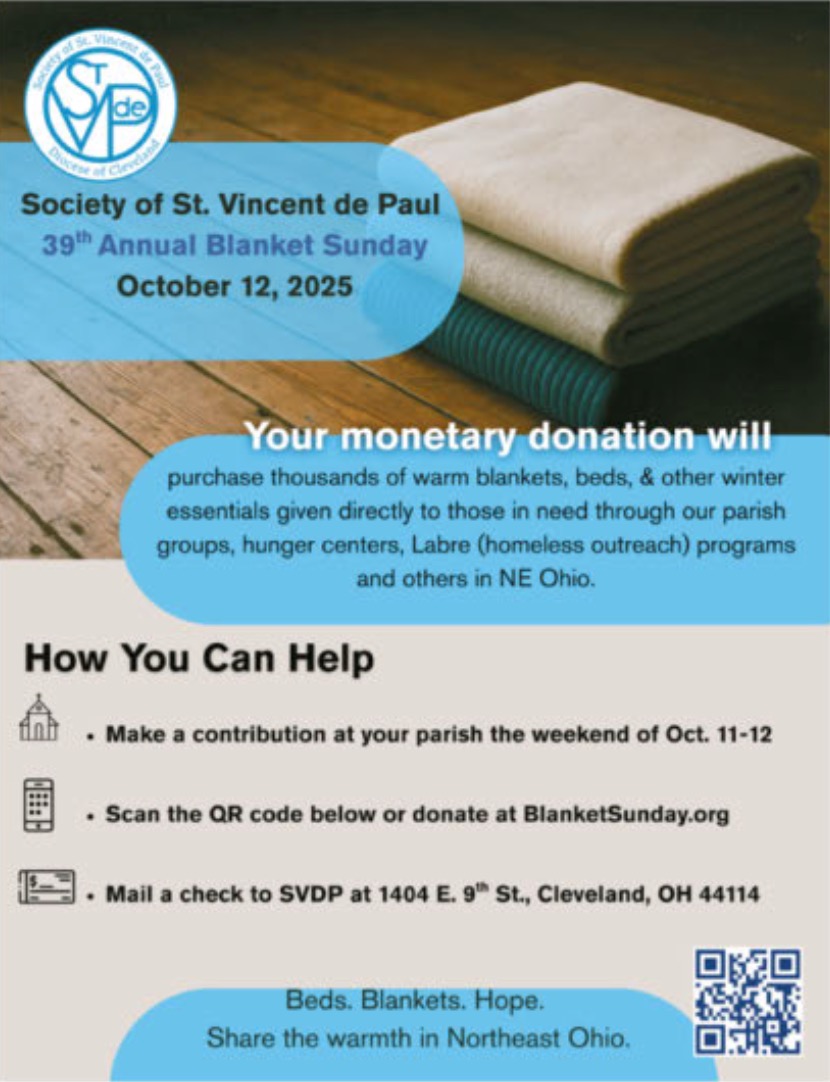 Your monetary donation will purchase thousands of warm blankets, beds, & other winter essentials given directly to those in need through our parish groups, hunger centers, Labre (homeless outreach) programs and others in NE Ohio.