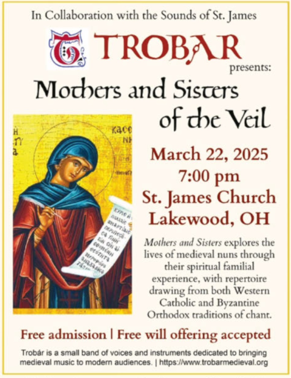 transcendent beauty of chant! The concert will be on Saturday, March 22nd at 7pm here at St James.