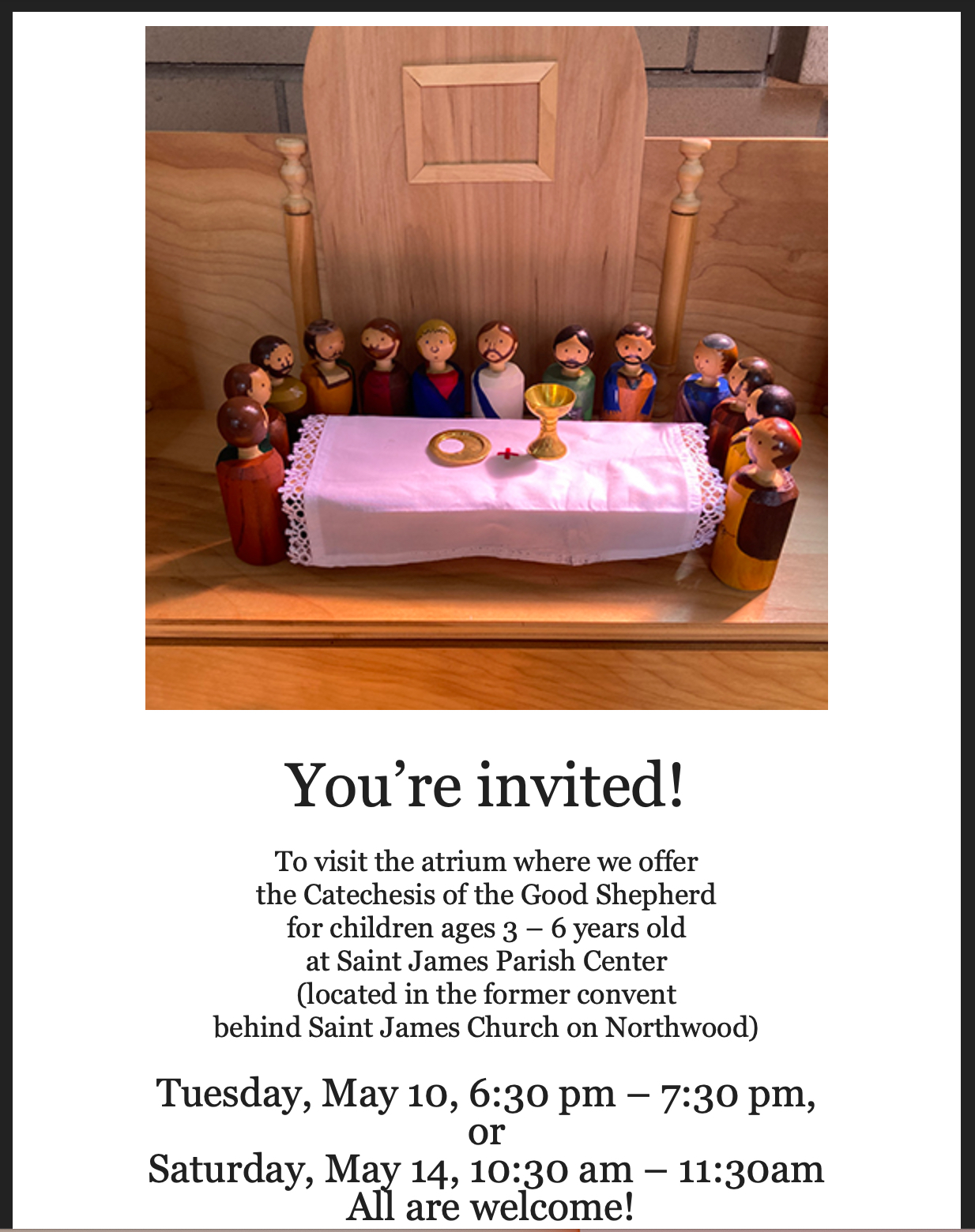 You’re Invited to Visit the Atrium May 10, 2022 6:30 pm - 7:30 pm St James Church - Parish Center All St. Clement and St. James parishioners are invited where we offer the Catechesis of the Good Shepherd. Watch a brief video