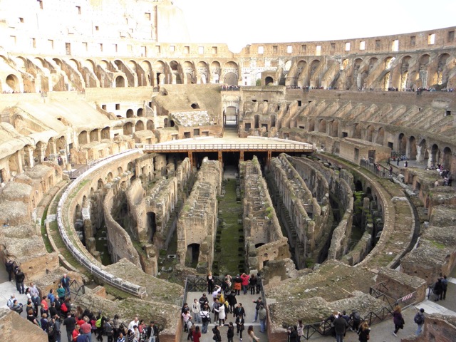 Construction began around 70 A.D. commissioned by Emperor Vespasian of the Flavian Dynasty. When completed and opened in 80 A.D., this massive stone arena was known as the Flavian Amphitheater. With construction technology available to them 2000 years ago, it is an engineering marvel of Roman builders. Upon completion, the four main floors reached a height of 157 feet. Measuring 620 by 513 feet, the outside perimeter is 1788 feet. The central arena is 180 feet wide and 287 feet long. Below the central arena is a series of tunnels and rooms that housed gladiators and wild animals. Hand operated elevators raised gladiators and wild animals to the arena floor. Capacity of the Colosseum was estimated to be between 50,000 and 75,000 spectators.