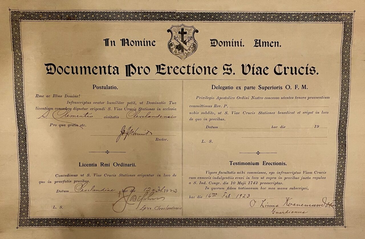 Reverend Joseph J. Schmit (the “Rector”) from the St. Clement Parish certifies that the Stations of the Cross had been properly erected as of February 12, 1923.