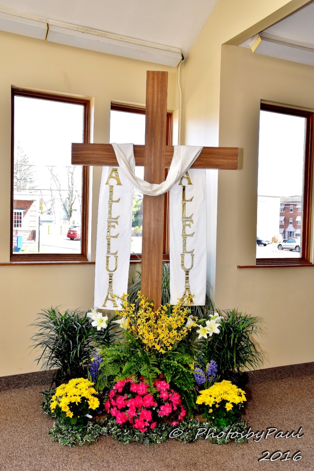 This cross and flowers represent a focal point for the proclamation of “Alleluia! Christ is Risen, He is risen indeed!” Luke 24:34
