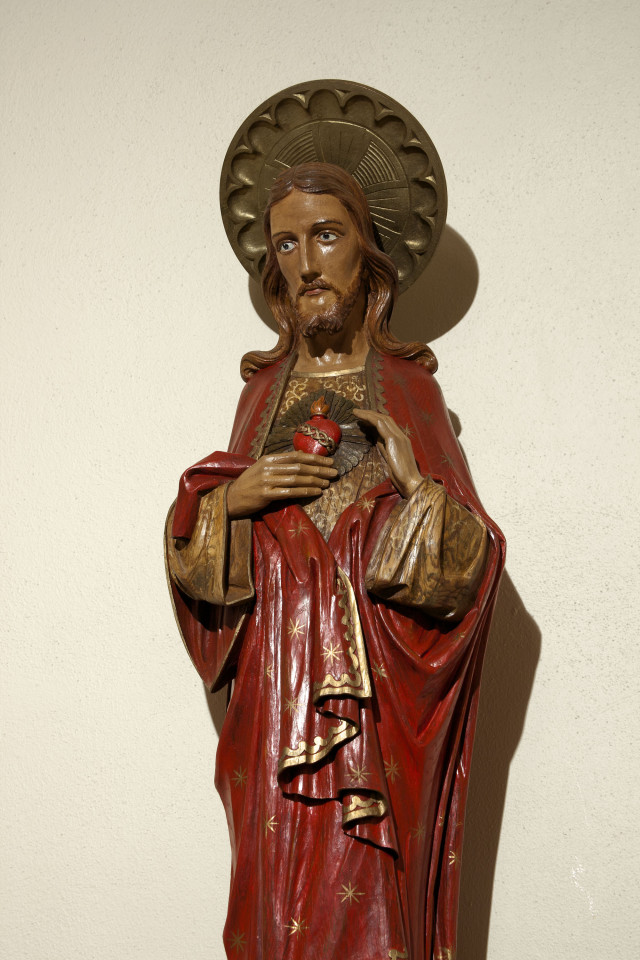 The shrine of the Sacred Heart is separated from the nave of the church by plaster arches. Made of marble with a tabernacle inset. The Statue of the Sacred Heart was carved from wood at Oberammergua and decorated in the studios of the Rambusch Decorating Company to conform with the original decorative scheme reminiscent of the early church. The marble rail was reconstructed from the original communion rail during the 1968 renovation.