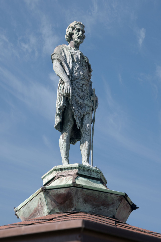 This statue of St. John the Baptist sits atop the roof the the baptistery on the Madison street side of the church. He is depicted wearing animal skins representing the camel-skin coat of the Gospels and holding a crude style cross.
