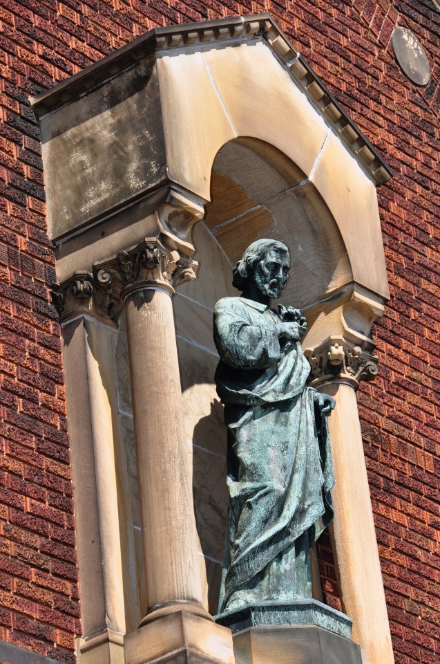 This statue of St. Joseph can be found in the rear of the church, above the entrance to the sacristy. It was placed there during the 1931-32 expansion of the sanctuary and sacristy. St. Joseph is the patron saint of Fathers, Carpenters and Social Justice.