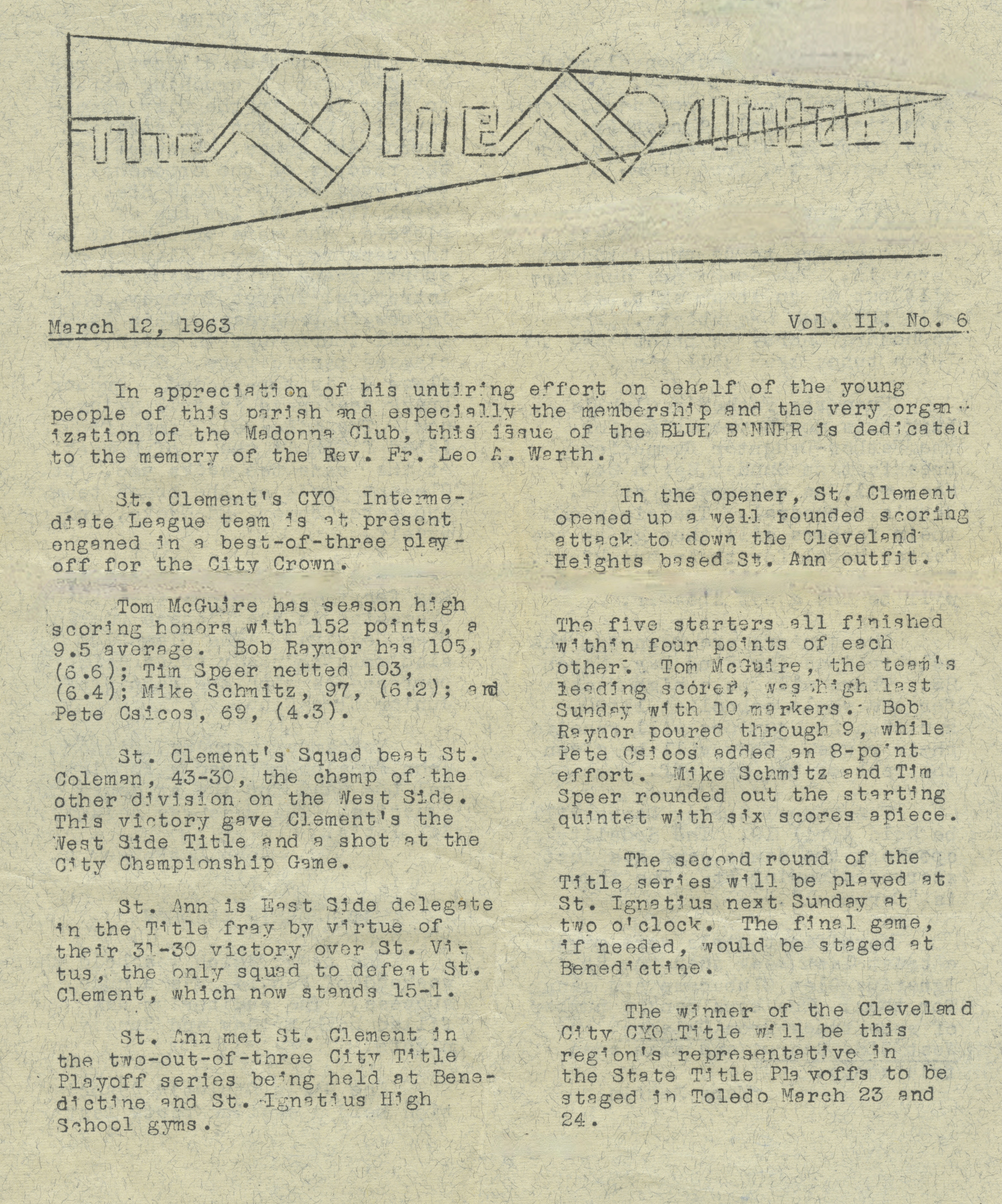 1963 The Blue Banner Madonna Club’s article about St. Clement Basketball Team.